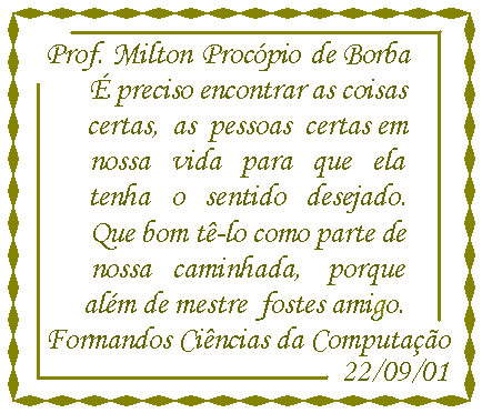 Homenagem dos Formandos Adriano José Waltrick de Athayde Alcides Roberto de Matos Edésio Gobetti Schemes Junior Evandro Luquini Fabiane Mund Fernando José Muchalski Joaquim Cabral da Maia Neto Kariston Pereira Luiz Melo Romão Marcos Vincius Linhares Marisa Fischer Roberto Hess Campos Roberto Kern Gomes Robson Romeo Schneider Sven Siegfried Imfeld 2ª Turma de Ciências da Computação |